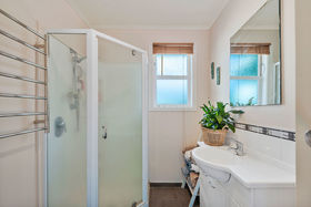 The bathroom has been renovated and the polished wooden flooring adds a